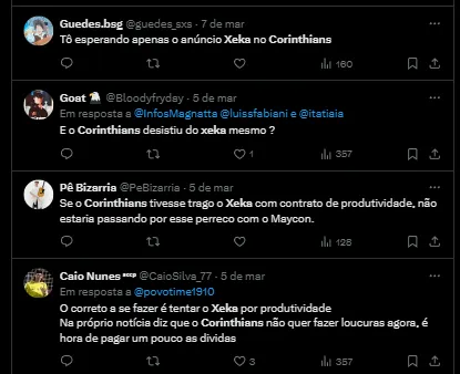 As informações são de que embora o treinador goste do jogador, as negociações esfriaram e a tendência é que ele não seja contratado pelo Clube do Parque São Jorge para 2023.