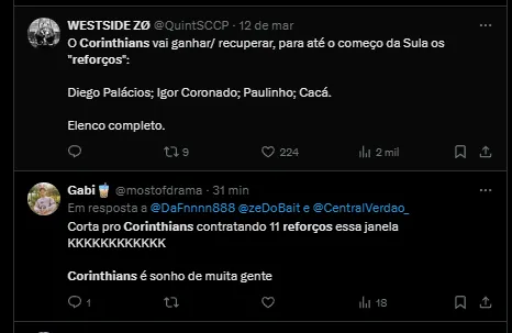 Porém, o colega Jorge Nicola, trouxe uma informação nesta segunda-feira (18) sobre essa possível movimentação. O jornalista afirmou que em contato com uma fonte dentro do Alvinegro do Parque São recebeu a resposta de que esse pacotão de reforços não deve ser contratado.