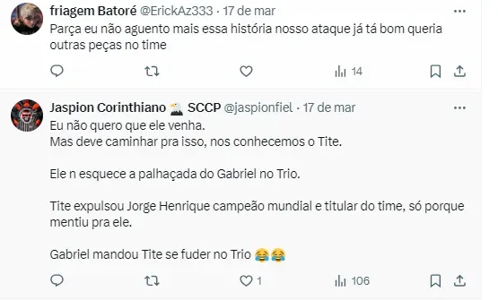 No entanto, o jornalista Samir Carvalho revelou que a direção alvinegra conversou com o empresário do atleta, Junior Pedrosa, após ter ficado um clima pesado nos bastidores. O agente tinha negado que uma oferta do Timão teria sido feita.
