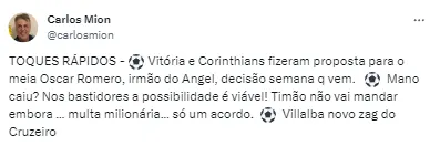 Com essas informações, segundo o que vem sendo sinalizado inicialmente pelo Clube, a gestão de Augusto Melo e sua diretoria de futebol não devem se movimentar na contratação do meia paraguaio Óscar Romero, pelo que ele vem sendo indicado neste primeiro momento.