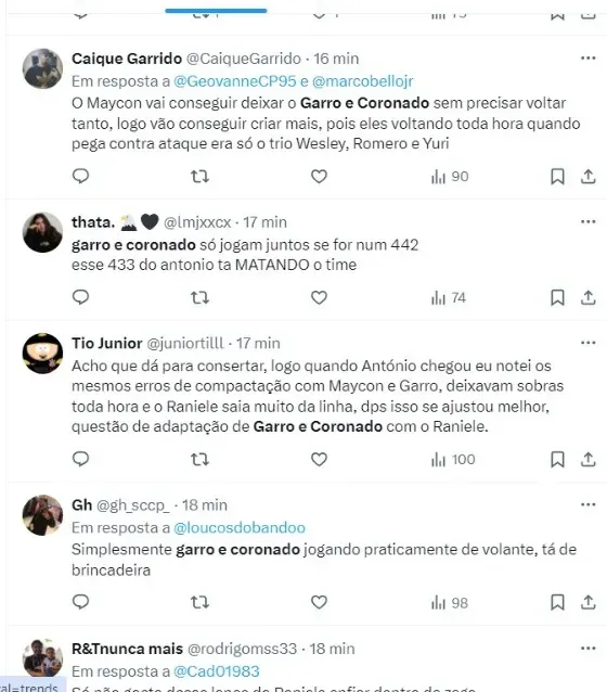 “O Corinthians melhora em estrutura tendo Garro e Coronado mais próximos da construção, mas os erros ridículos em último terço diminuem as chances, fazem o juventude se equiparar“, disse outro torcedor.