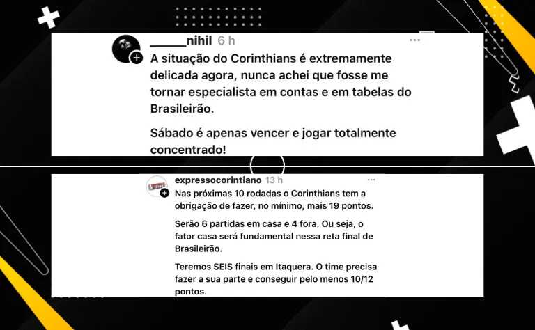 Até a 29ª rodada, o Timão tem 28 pontos conquistados e está em 18º lugar na tabela de classificação. O primeiro time fora da zona de rebaixamento é o Fluminense, com 30 pontos.