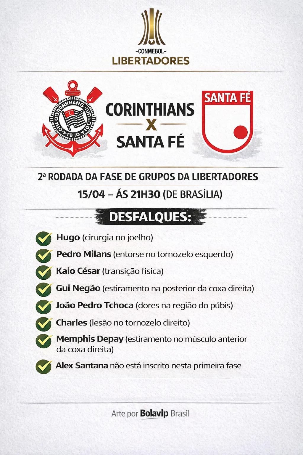 O Corinthians segue lidando com uma extensa lista de desfalques no elenco. Para o importante duelo contra o Santa Fé, nesta quarta-feira (15), Diniz não poderá contar com oito jogadores, o que reduz as opções disponíveis para 2ª rodada da Libertadores.