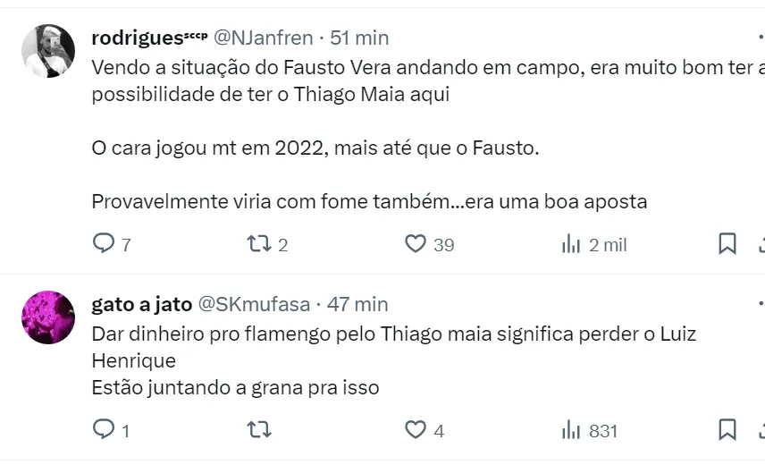 Além disso, a diretoria corinthiana voltou a analisar a possibilidade de contratar Thiago Maia, do Flamengo. Mas de acordo com o Globo Esporte, o Timão decidiu por não avançar nessa situação e não vai tentar mais fechar com o volante.
