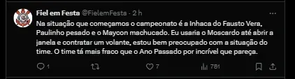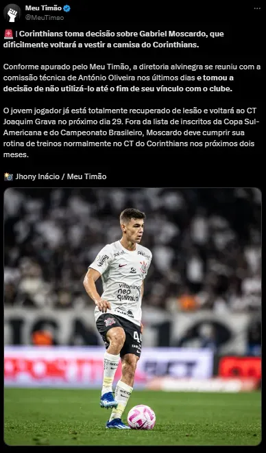 Vale destacar que ainda de acordo com o que foi publicado pelo Meu Timão, o Alvinegro do Parque São Jorge não inscreveu o meio-campista nem na Copa Sul-Americana e nem no Brasileirão Série A.
