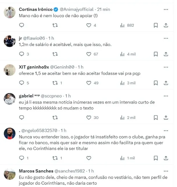 “A permanência do jogador, que tem contrato até 2026 com o Corinthians, vai depender das propostas que o clube vai ou não receber pelo atleta de 23 anos de idade. Há diversas sondagens de clubes do exterior por ele, o jogador tem mercado”, escreveu.