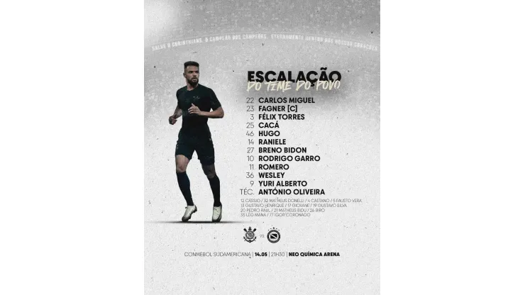 O Timão vai a campo com: Carlos Miguel, Fagner (C), Félix Torres, Cacá e Hugo; Raniele, Breno Bidon e Rodrigo Garro; Romero, Wesley e Yuri Alberto