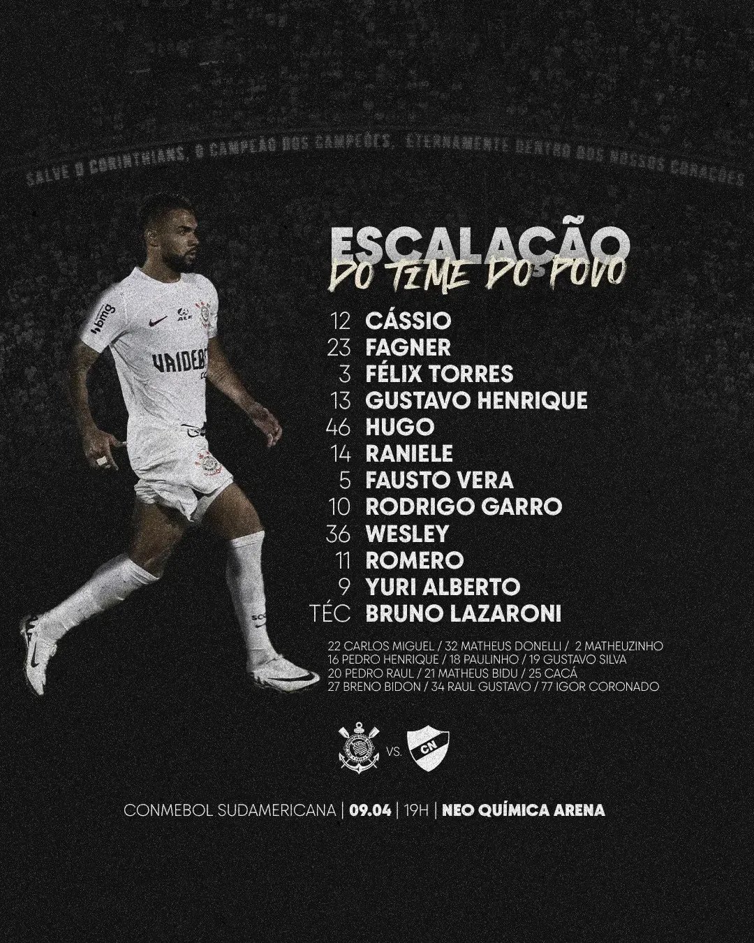 Nesta terça-feira (9), o Corinthians recebeu o Nacional, do Paraguai, na Neo Química Arena, pela segunda rodada da Copa Sul-Americana, e derrotou os paraguaios por 4 a 0, com dois gols de Romero, um de Yuri Alberto e um de Pedro Raul.