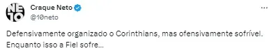 Porém, Neto ainda reforçou que apesar do resultado positivo conquistado fora de casa e da boa atuação da zaga no duelo, o setor ofensivo não foi bem na partida. “Defensivamente organizado o Corinthians, mas ofensivamente sofrível. Enquanto isso a Fiel sofre”.