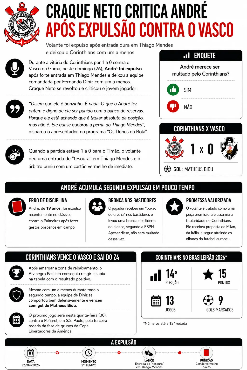 Durante a vitória do Corinthians por 1 a 0 contra o Vasco da Gama, neste domingo (26), André foi expulso após forte entrada em Thiago Mendes e deixou a equipe comandada por Fernando Diniz com um a menos. Craque Neto se revoltou e criticou o jovem jogador:
