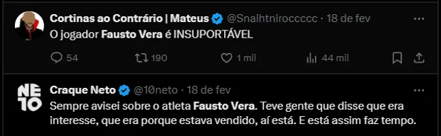 Com essa possibilidade de contratar um novo volante, a torcida do Corinthians comemora uma possível saída de Fausto Vera. Durante a pré-temporada, o atleta seria negociado, mas nenhum clube fechou um acordo com o Timão.