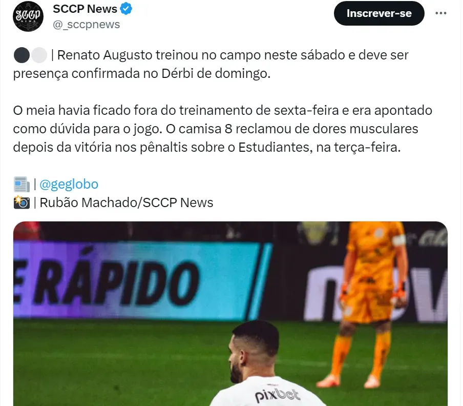 Mas em treino deste sábado (2), no CT Joaquim Grava, o camisa 8 corintiano treinou normalmente e vai enfrentar o Palmeiras, de acordo com o Globo Esporte. Contra o Estudiantes, da Argentina, Renato Augusto iniciou a partida atuando como ‘falso 9’, mas deve voltar para o meio-campo e, dessa forma, Yuri Alberto será titular no comando do ataque.