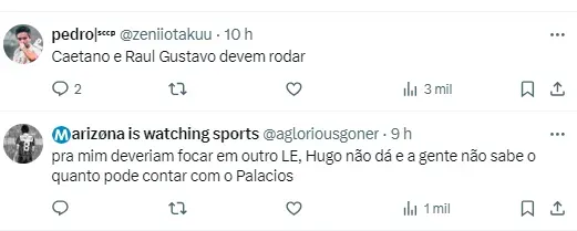 Outro setor que a diretoria também deseja reforçar é a lateral-esquerda. Rikelme, do Cuiabá, surgiu como opção, mas os altos valores deverão fazer o Todo Poderoso buscar outras alternativas.