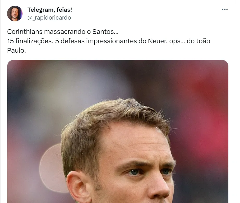 A boa atuação do goleiro do Peixe no clássico de hoje fez a torcida do Corinthians na web lamentar e comparar o jogador rival com Neuer, do Bayern de Munique, da Alemanha.