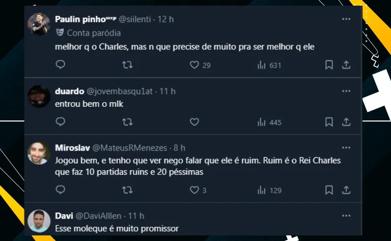 Por fim, falando novamente de Ryan, a boa atuação fez a Fiel Torcida criticar o volante Charles, que tem muito mais chances e não fez um bom primeiro tempo. Confira a repercussão com a boa atuação de Ryan: