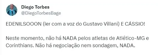 “Neste momento, não há NADA pelos atletas de Atlético-MG e Corinthians. Não há negociação nem sondagem, NADA”, escreveu o comunicador, que cobre o dia a dia do Grêmio.
