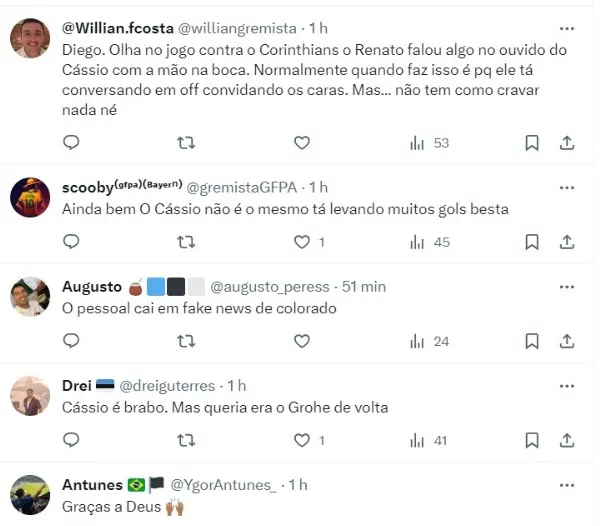 Em sua conta oficial no X (antigo Twitter), ele escreveu sobre o interesse do Grêmio em Cássio e Edenilson, dois atletas que seriam pedidos para a próxima temporada, mas negou veementemente.