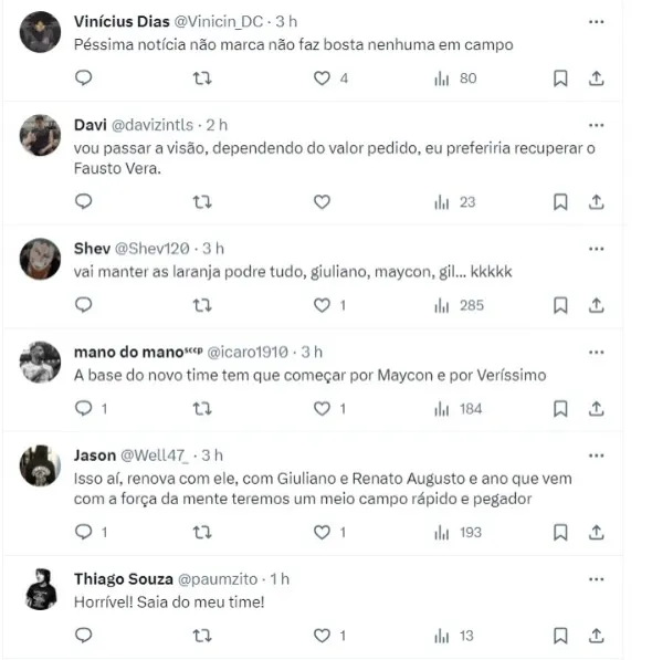 “Eu não renovaria, vive lesionado e smp perde metade ds temporada por isso, sem contar que oscila dms“, disse um torcedor no X, antigo Twitter. “Ótimo!!! Do atual elenco, acho que dá para renovar com o Maycon, com o Veríssimo é talvez com o Bruno Mendez, dependendo do valor. O resto, aquele“, completou.