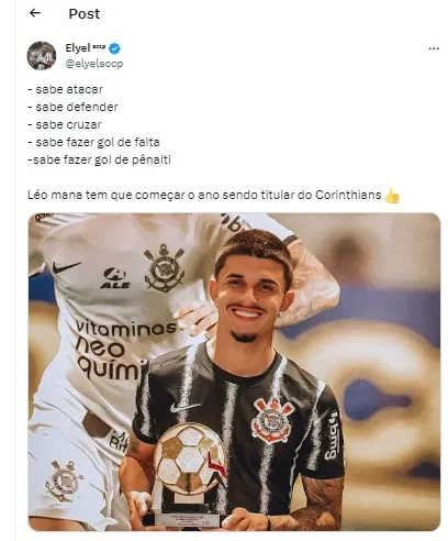 Atualmente com 19 anos, o jogador completa 20, ele está no Corinthians desde os sete ano e nunca vestiu camisa de outro time desde que decidiu seguir a carreira no futebol.