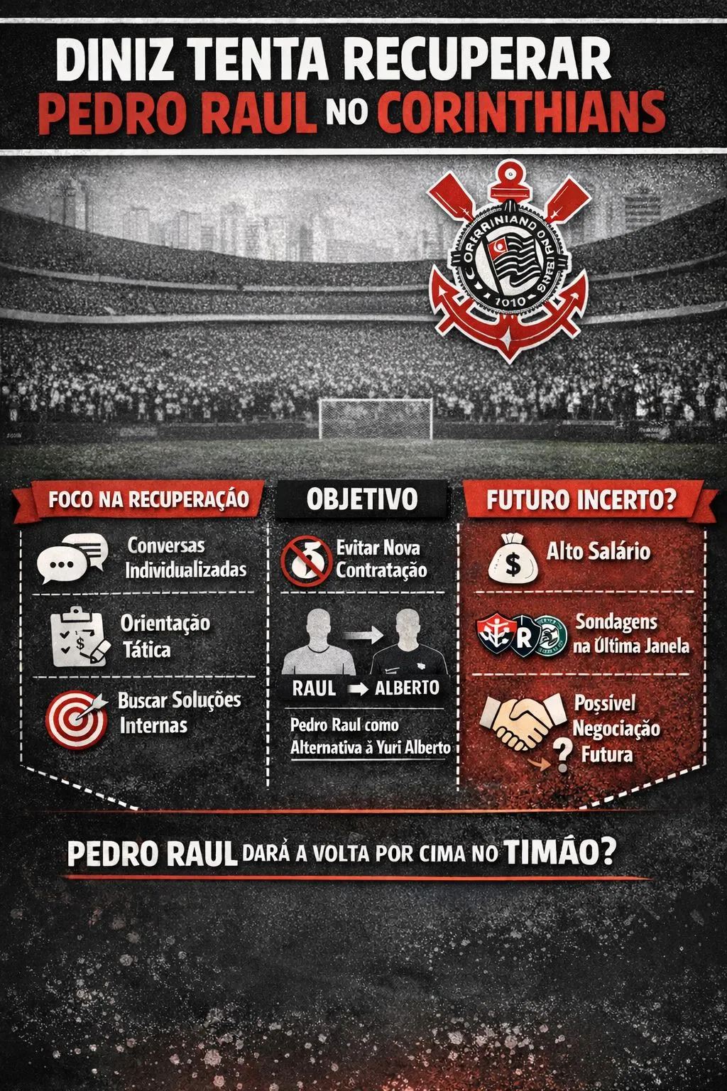 Apesar da confiança de Diniz, o futuro de Pedro Raul no Corinthians ainda não está garantido. O jogador tem um salário considerado alto em relação ao que apresentou até aqui, o que gera questionamentos internos.