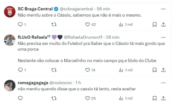 “O preparador de goleiros ficou olhando para ele. Ouvi até de um jogador: ‘Falar, ele (o dirigente) pode falar… Duro é ele achar que vão tirar o Cássio’”, continuo ele, trazendo esses bastidores. Em seguida, foi a vez de Zé Elias.