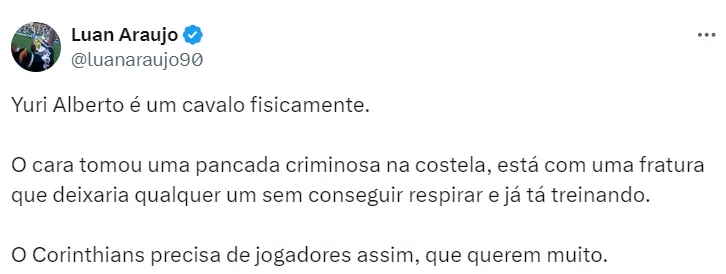 No entanto, apesar de ser desfalque, a situação de Yuri Alberto é menos alarmante do que parecia. Após algumas avaliações do departamento médico corinthiano, foi constatada uma fissura na costela do atacante.