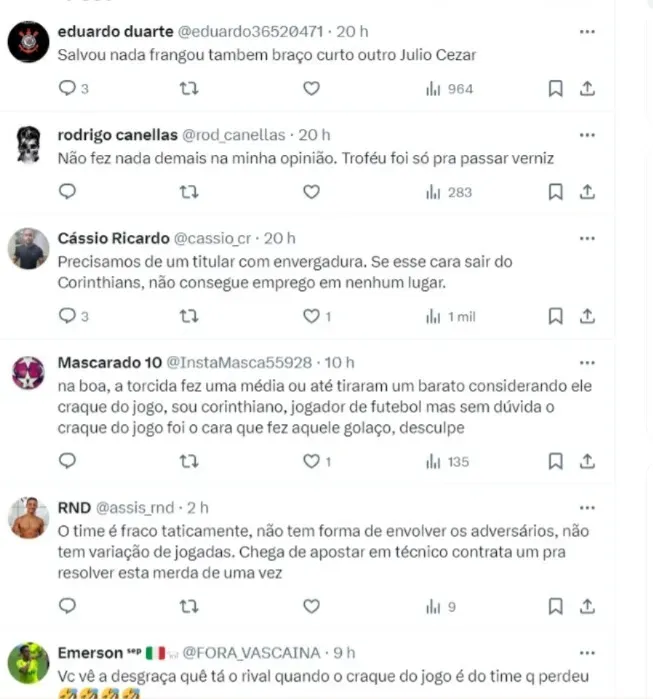 O goleiro atuou como titular na derrota do Corinthians para o Internacional, por 1 a 0, na noite da última quarta-feira (19), pela 10ª rodada do Campeonato Brasileiro.