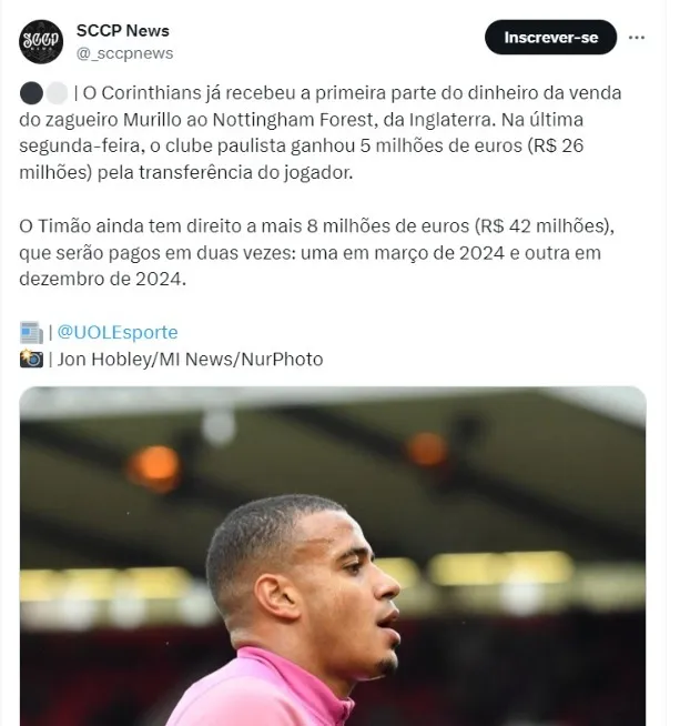 O Corinthians já recebeu a primeira parte do dinheiro da venda do zagueiro Murillo ao Nottingham Forest, da Inglaterra, de acordo com informações do UOL Esporte.