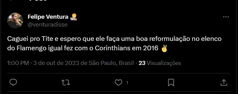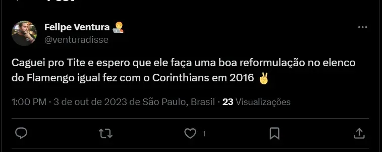 “Tite fez pior que o VP quer você queira admitir ou não. O português não pisa mais no Corinthians já o Tite se fracassar no mengão, com certeza vai ter campanha da fiel pela volta”.