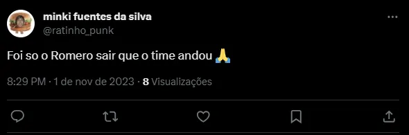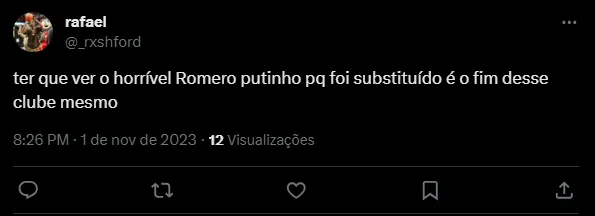“Ter que ver o horrível Romero p da vida poirque foi substituído é o fim desse clube mesmo”, “Ter que ver Romero bravo kkkkkkkkkkkkkkkkkkkkkkkkk, o Corinthians de Duilio” e “Foi só o Romero sair que o time andou”, foram alguns comentários.