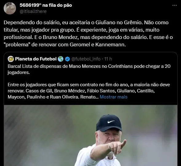 “Giuliano já foi informado pelo Corinthians e por Mano Menezes que não renovará com o clube. O jogador tem afinidade com o Grêmio e gosta de Porto Alegre. No entanto, o assunto ainda está sendo tratado com cautela, já que o jogador tem contrato até o final de 2023”, disse uma fonte da cúpula gremista ao jornalista Rafael da Roza, do Portal do Gremista.