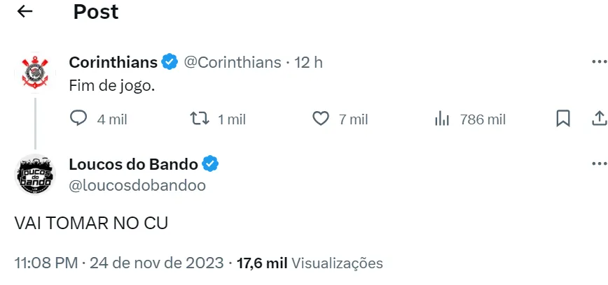 “Esses jogadores que estão aí, tirando o Cássio, o restante deveria repensar se vocês merecem vestir essa camisa tão sagrada que é a do Corinthians. E por sinal, vão todos vocês para a p*** que pariu”, finalizou Neto.