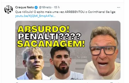 Neto ainda encerrou sua fala reforçando o erro que prejudicou a equipe. “Espera aí. Dar um pênalti desse é o absurdo do absurdo. É vergonhoso o que fizeram com o Corinthians na Neo Química Arena. Parabéns, Seneme”.
