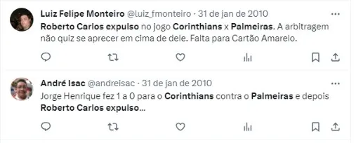 “Foi um jogo contra o Palmeiras, a gente estava ganhando de 1 a 0 e o Roberto Carlos foi expulso. Foi o primeiro jogo do Roberto contra o Palmeiras desde que ele deixou o Palmeiras, iniciou
