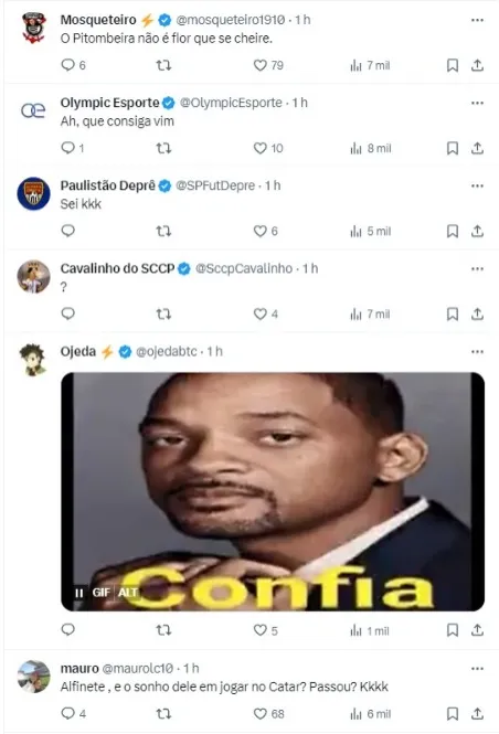 “Informação sobre Roger Guedes. Muita gente falando que o Corinthians está atrás do retorno do atleta, o que acontece é ao contrário. Guedes que quer voltar e quem está procurando o clube é o staff do atleta e não ao contrário“, publicou Alfinete.