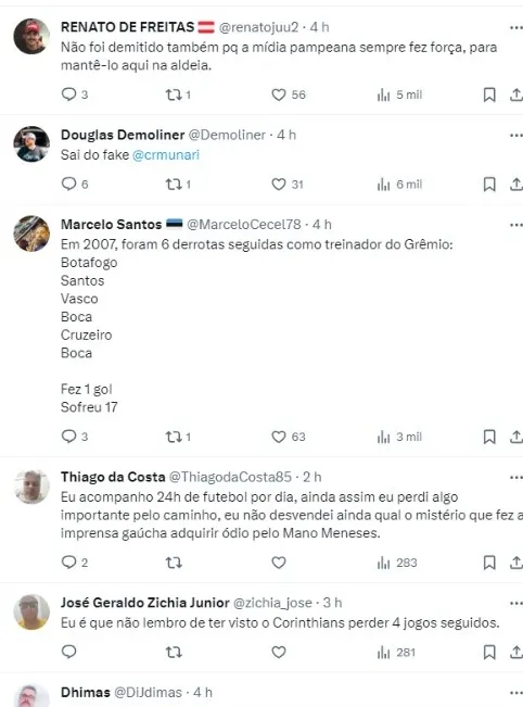 Já perto do fim da sua passagem pelo Inter, Mano Menezes havia perdido cinco duelos seguidos, para o: São Paulo, Athletico-PR, Atlético-MG, América-MG e Grêmio.