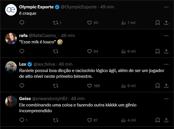 “É um cara que tem muita personalidade, busca o jogo o tempo inteiro, um cara que não se omite em momento algum. Então, fico feliz por ele, por ter saído esse gol, por ter sido da maneira que foi, a gente espera que venha muito mais“, completou Raniele.