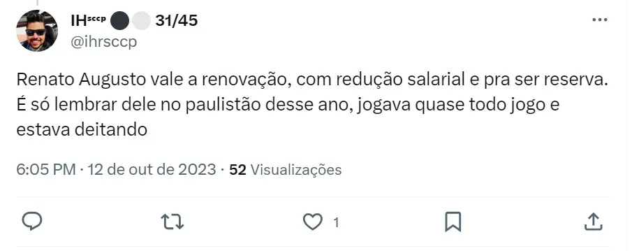 No programa Os Donos da Bola, do Rio Grande do Sul, o jornalista Alexandre Mota disse que o meia Renato Augusto pode estar de saída do Corinthians para atuar em Porto Alegre em 2024: “A informação que vem de São Paulo é que Renato Augusto vai jogar no Grêmio ou no Inter ano que vem! Que ele estaria vindo para o Sul”, disse o comunicador nesta quarta-feira (18).