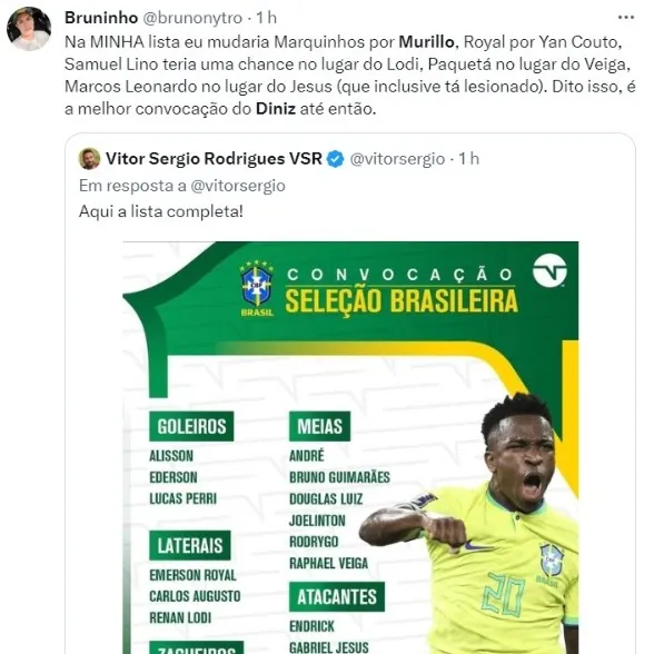 “Incrível como o Diniz não convocou nem o Murillo nem o Robert Renan”, reclamou uma torcedora, relembrando também de outra Cria do Terrão. Veja outros comentários: