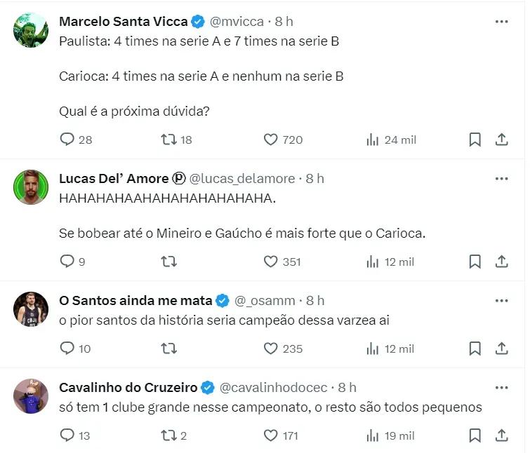 Isso porque, os torcedores destacaram o nível das equipes que disputam as duas competições, destacando a força do Paulistão. Entretanto, para o profissional o carioca, atualmente, é superior.