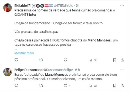 “Mas temos que olhar com os pés muito firmes onde estamos, porque daqui a pouco começa a olhar muito para cima e esquece o que está jogando nesse momento’, disse Mano Menezes, que provocou o Internacional: