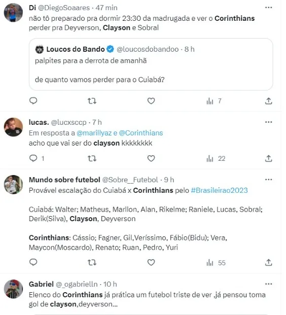Ao ser questionado, disse que vai comemorar o gol caso faça: “Isso é muito individual de cada jogador, é muito ali do momento, mas eu acredito que comemore, até porque eu acho uma falta de respeito com o Cuiabá, que é clube que me paga, coloca comida dentro de casa. Os torcedores vão estar lá para apoiar, meus companheiros vão estar me ajudando, então eu acho que comemorar contra eles não tem nenhum desrespeito contra o Corinthians. Seria bem legal também para os torcedores do Cuiabá”, disse o atacante, que vive boa fase atualmente.