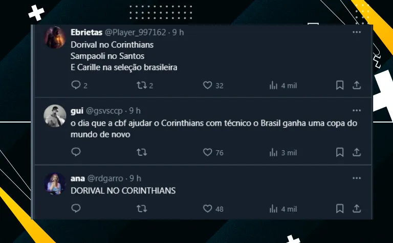 Por fim, após parte dos corintianos sugerirem a contratação de Dorival Júnior, o assunto “bombou” e causou polêmica na Fiel Torcida, já que passou longe de ser uma unanimidade.