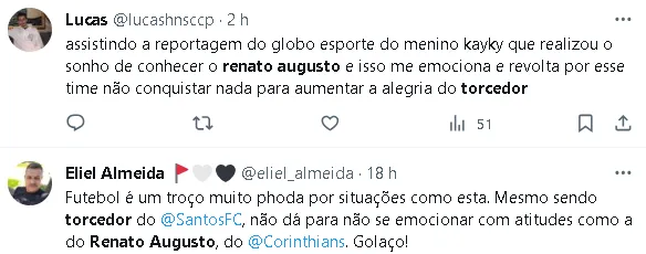 O encontro com Renato Augusto trouxe intensa alegria para Kayky, um torcedor fervoroso do Corinthians, que expressou sua emoção dizendo:
