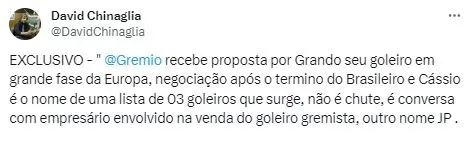O jornalista expôs que o empresário que negocia a venda do goleiro gremista revelou o interesse do Clube gaúcho, todavia, também entregou que assim como Cássio, o goleiro João Paulo, do Santos, é outro nome na lista do Grêmio.