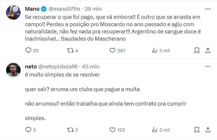 Vale destacar que o Olympiacos da Grécia chegou a oferecer 6 milhões de euros, cerca de R$ 32 milhões, buscando a contratação de Fausto Vera. Mas a oferta foi recusada pelo presidente Augusto Melo.