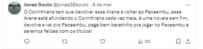 “O Timão definiu que quer vender os naming rights do CT Joaquim Grava por R$ 250 milhões por dez anos”, completou o colega destacando o outro negócio por exploração de marca.