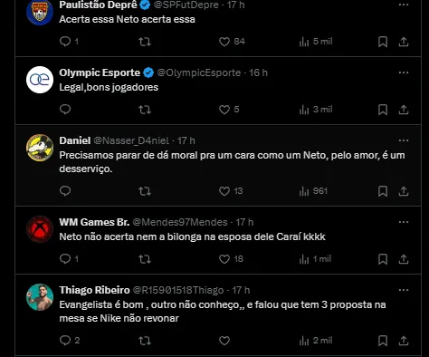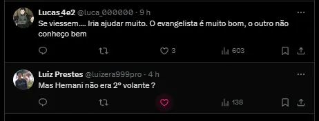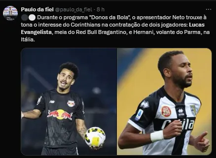 Ele revelou que os jogadores na mira do Clube são: Lucas Evangelista e Hernani. “O Corinthians é louco para contratar o Evangelista e o Hernani também, que é bom de bola”, informou Neto em seu programa.
