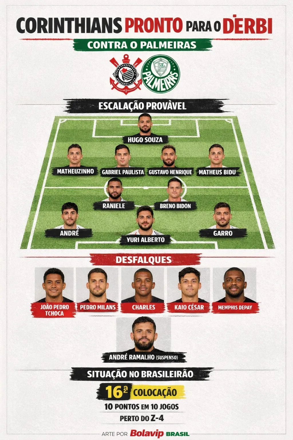 Além dos lesionados, André Ramalho também será ausência no Dérbi Paulista deste domingo (12), já que cumpre suspensão. A ausência do defensor amplia a lista de baixas e aumenta o desafio do Timão, exigindo ajustes na equipe de Fernando Diniz.