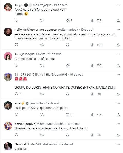 “Olha a situação do Corinthians. Mas a culpa não era do Luxa? Eu acho que o Mano é melhor treinador que o Luxa. Pra 2024, seria melhor pro Corinthians do que o Luxa. Mas eu não sei se era a hora de trocar. Achou um empate no último lance do jogo contra o América-MG, se fosse o Luxa…”, declarou André Henning, na TNT Sports. Para finalizar, o jornalista faz um alerta: “Conhecendo o Corinthians, se entrar na zona de rebaixamento, vai ser duro sair. Entra numa vibe muito, muito complicada. Que abra o olho”.